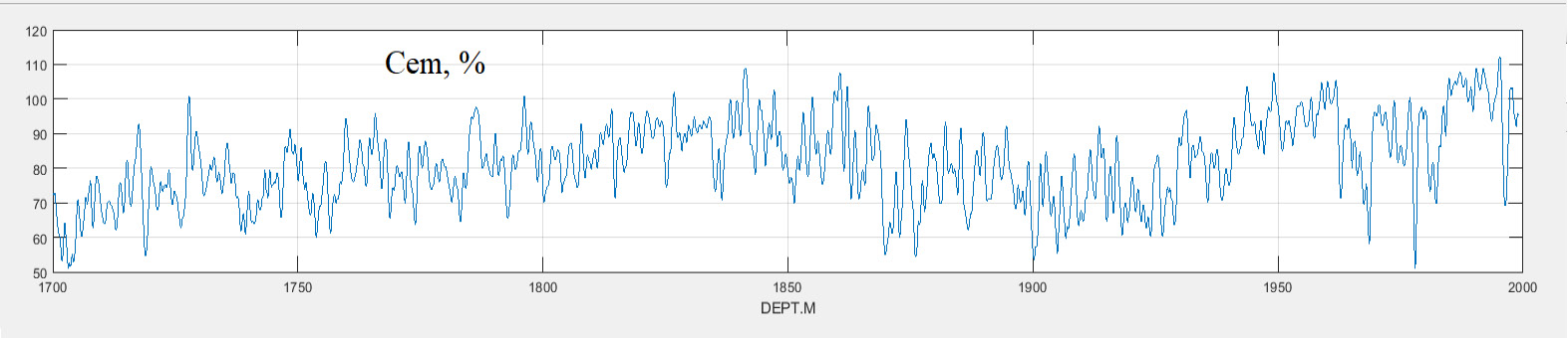 Результатом ННК-Ц служит цементограмма объёмной доли цементного камня (Cem) от всего затрубного пространства в каждом кванте глубины протяженностью 10 или 20 см. Величина Cem является интегральным показателем степени целостности цемента, а величина 1-Cem – интегральным показателем разрушенности цемента или доли его изначального отсутствия при цементировании.