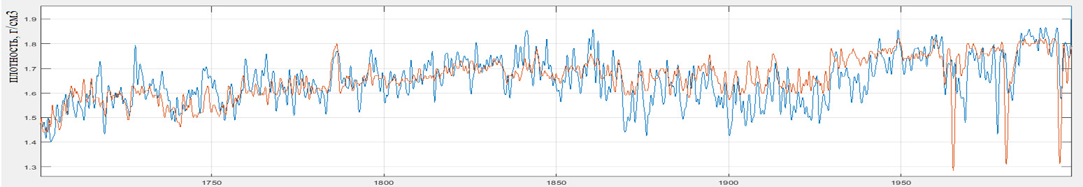 Рисунок 6. Сопоставление кривых плотности заколонного пространства, полученных предложенным методом ННК-Ц по данным тепловых зондов 2ННК-Т (синяя кривая) и независимо по СГДТ (коричневая кривая) при оценке степени разрушенности цемента