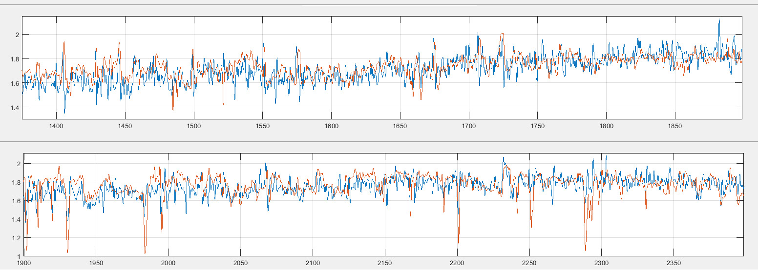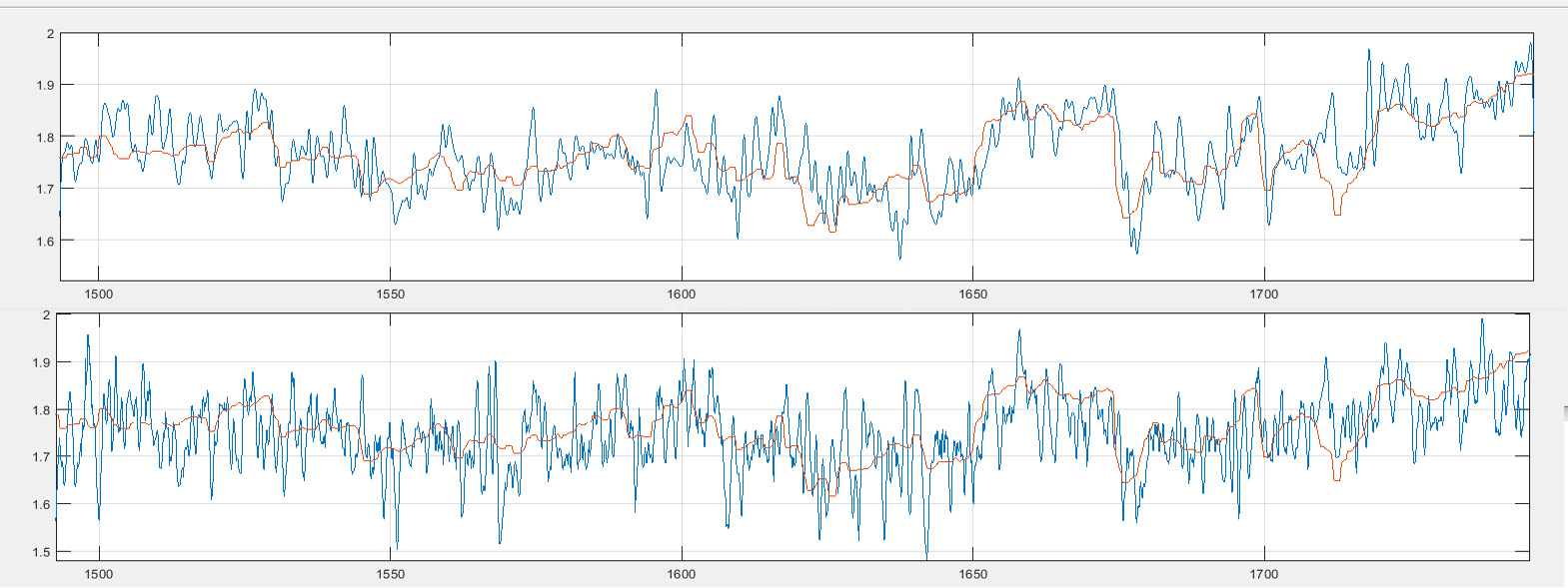Figure 6. Comparison of borehole annulus density curves obtained by the proposed NNL-C method using 2NNL-T thermal probes (blue curve) and independent cement density log (brown curve) when estimating the degree of cement failure