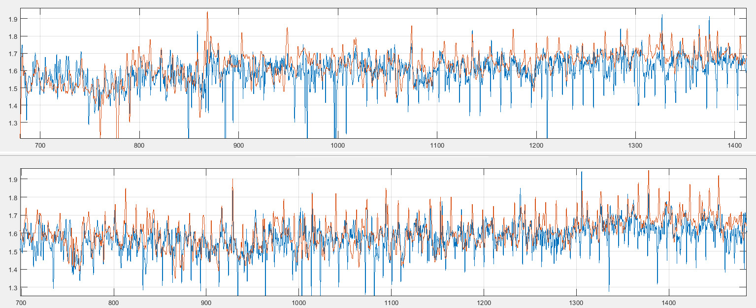 Рисунок 8. Сопоставление кривых плотности заколонного пространства, полученных предложенным методом ННК-Ц (синие кривые) и независимо по СГДТ (коричневые кривые) при оценке степени разрушенности цемента в двух скважинах