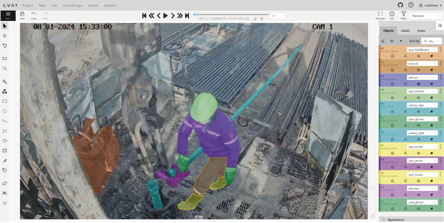 Для формирования датасета были использованы видеоматериалы, полученные на месторождении Жетыбай от бригады капитального ремонта скважин в количестве 300 файлов. Эти видеофайлы подверглись тщательному ручному анализу, в результате которого был отобран 91 файл, соответствующий следующим критериям качества: отсутствие чёрного экрана, достаточное освещение, корректный ракурс камеры, наличие активности на сцене и минимальный уровень зашумленности кадров. Для преобразования видеоматериалов в изображения и последующей систематизации данных были созданы соответствующие папки (рис. 1). Разметка данных осуществлялась с использованием инструмента CVAT [6] от компании CVAT.AI (рис. 2), который был установлен на локальном сервере для повышения удобства и эффективности процесса.