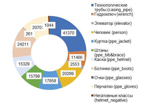 В процессе разметки были выделены 16 классов: технологические трубы, гидравлический ключ, элеватор, человек, каска, очки, жакет, перчатки, штаны, ботинки, а также негативные классы СИЗ: каска-негатив, очки-негатив, жакет-негатив, перчатки-негатив, штаны-негатив, ботинки-негатив. Негативные классы предназначены для случаев, когда работник не использует специальную защитную одежду, а надевает обычную одежду.