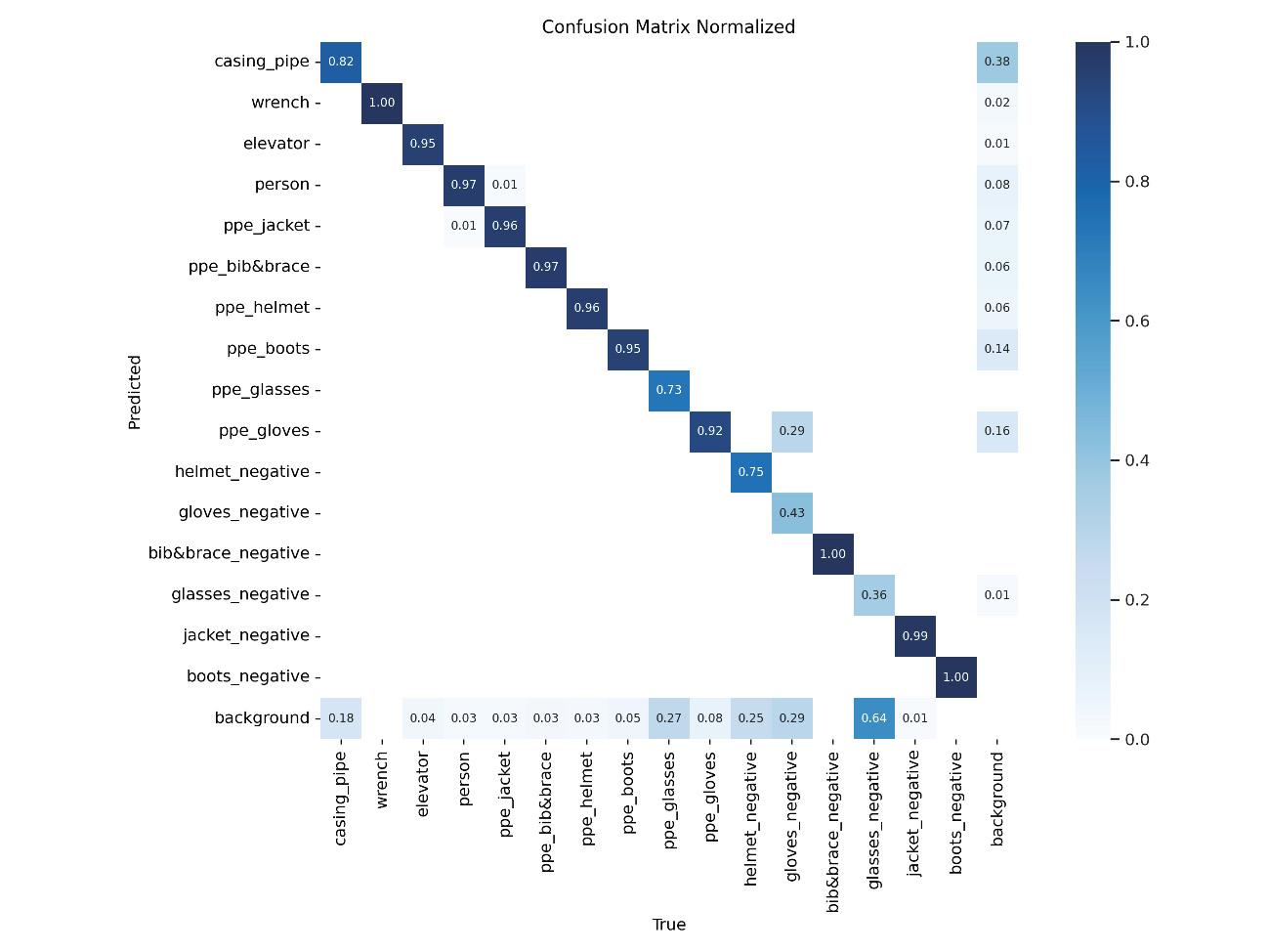Results: The resulting dataset consists of 16 classes. It includes personal protective equipment (helmet, glasses, jacket, gloves, trousers, and boots) as well as their absence, represented by negative classes. It also covers key production elements such as casing pipes, a hydraulic wrench, an elevator, and personnel. The dataset is used to train computer vision models. Models trained on this dataset have demonstrated stable performance under real-world industrial conditions.