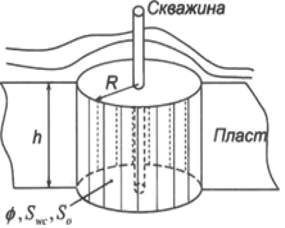 Методика построения карт радиусов выработки базируется на расчёте площади сечения цилиндра вокруг каждой скважины (рис. 2) таким образом, чтобы эта площадь соответствовала объёму накопленной добычи флюида [7]. При этом используются следующие уравнения (1–4):