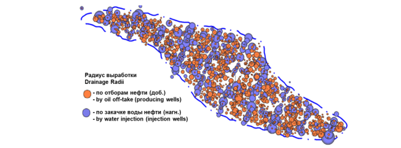 Совмещение карт радиусов выработки нефти и закачки воды позволило визуализировать: