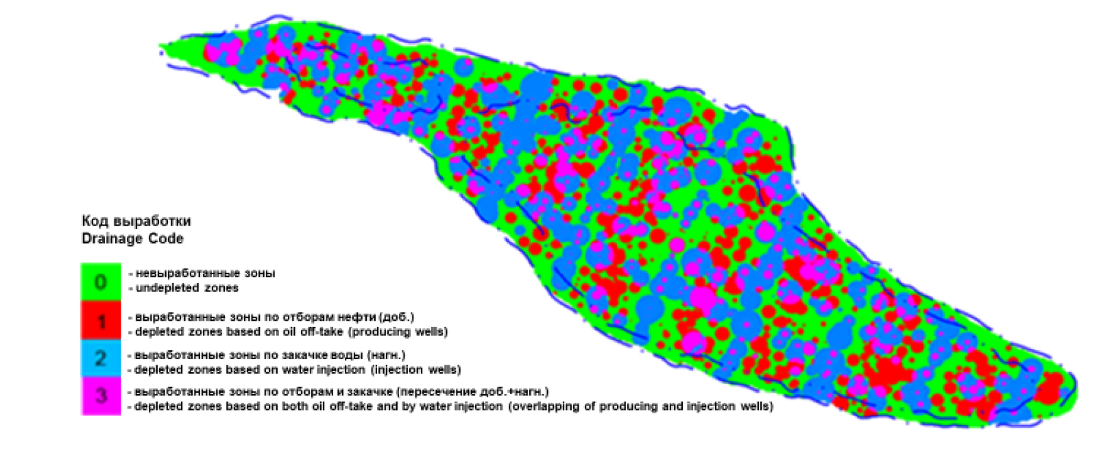 Materials and methods: This approach implements methodology for the construction of depletion maps based on the analytical modelling of drainage radii of production wells, as well as analysis of changes in reservoir fluid mineralization based on laboratory measurement of the composition of produced and injected water. .
