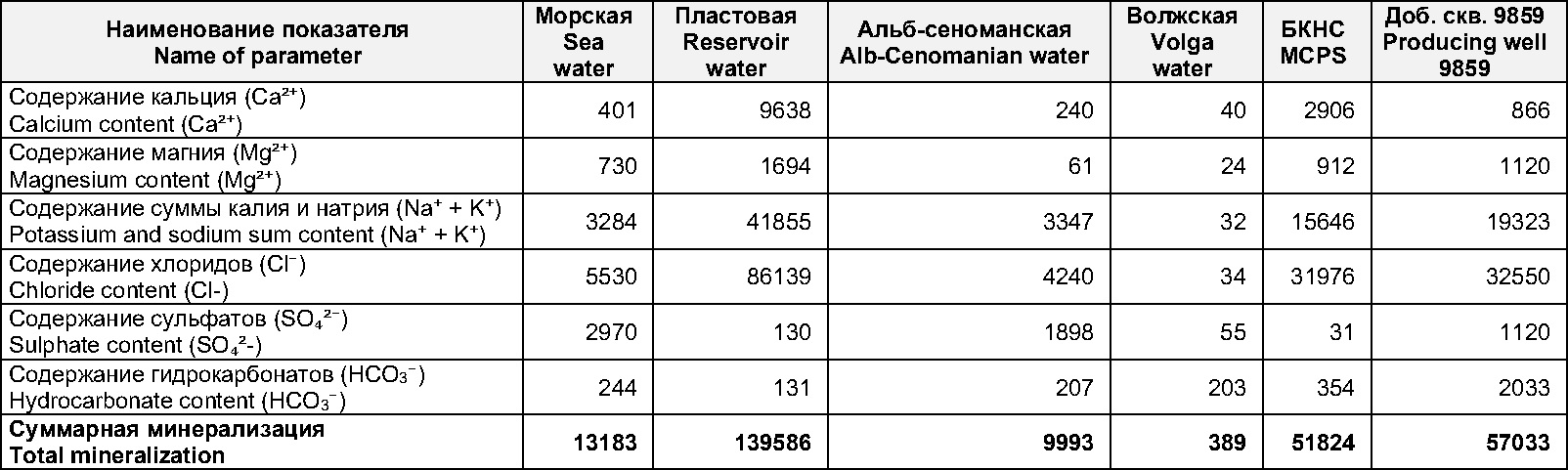 Данные типы вод значительно отличаются друг от друга как по общей минерализации (более чем в 10 раз), так и по составу отдельных компонентов (табл. 1). На эксплуатационных объектах при закачке, добыче и подготовке нефти и закачиваемой воды происходит постоянное смешение разных типов вод.