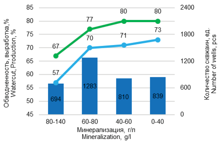 ‒ зоны с высокой минерализацией (80–140 г/л) характеризуются меньшей выработкой (67%) и обводнённостью (57%);