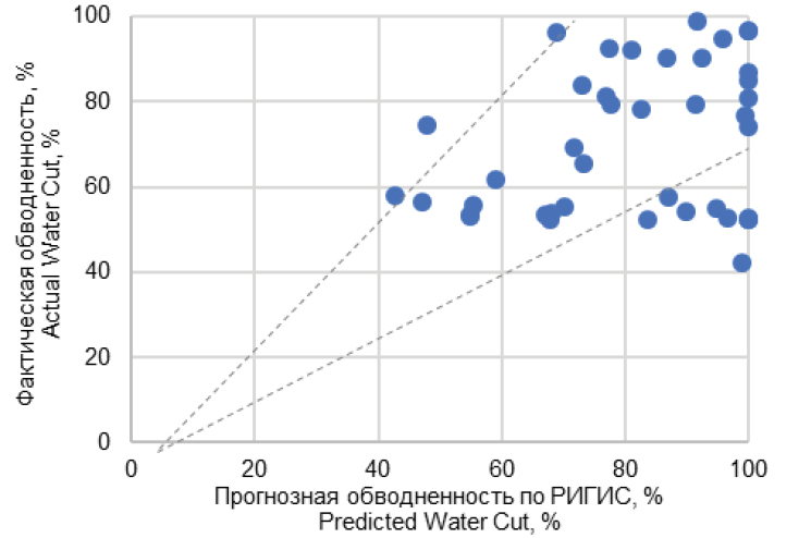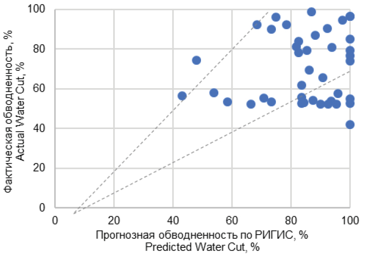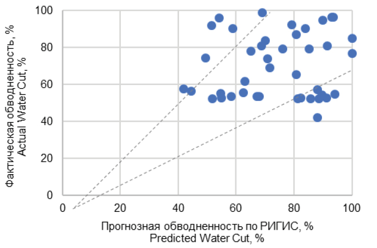 ‒ кросс-плот сопоставления фактической и прогнозной обводнённостей по РИГИС при текущей минерализации с карт (рис. 10).