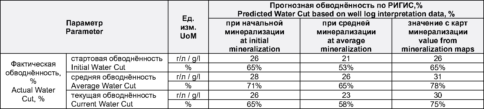 Таблица 3. Сопоставление фактической и прогнозной обводнённостей по РИГИС при различных вариантах минерализации