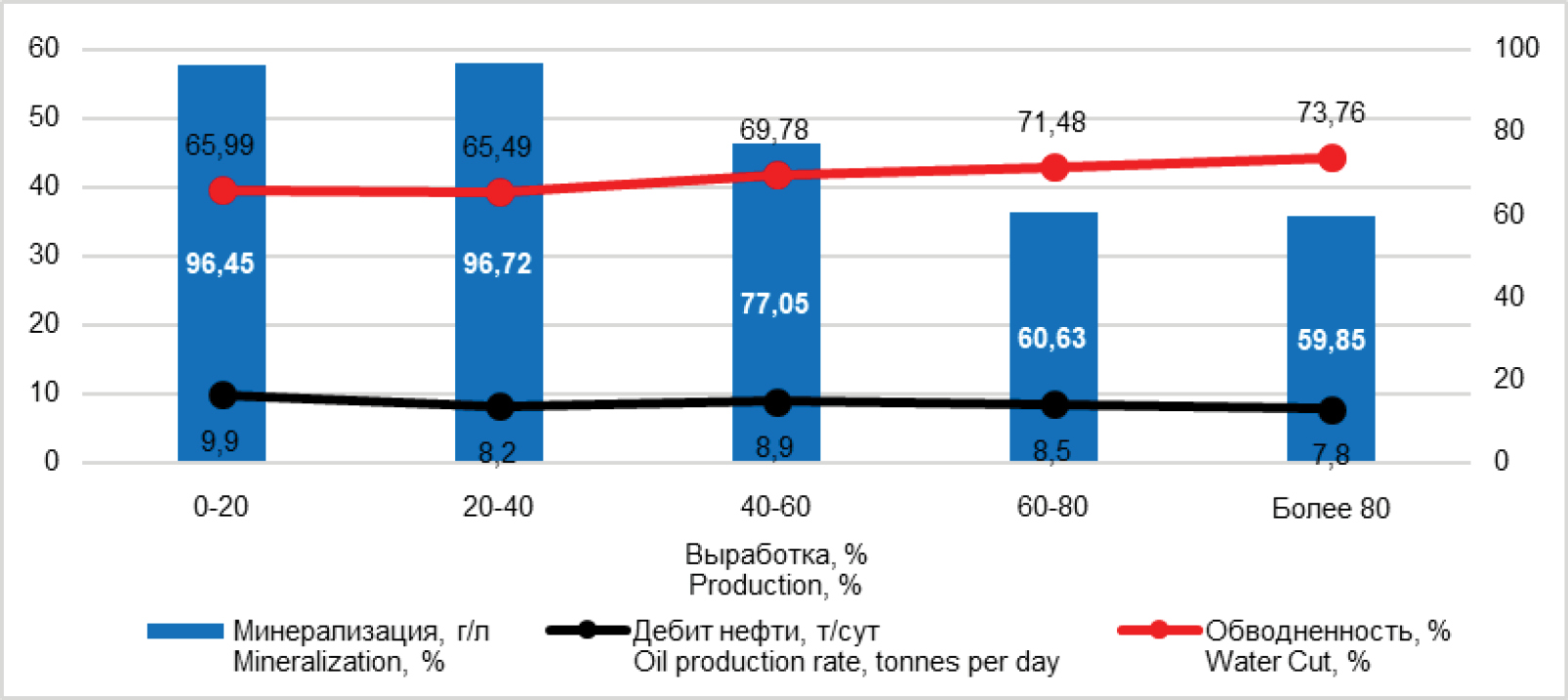 Наблюдается чёткая корреляция между степенью выработки запасов, минерализацией пластовых вод и уровнем обводнённости скважин. Так, низкая минерализация (<40 г/л) соответствует высокой степени выработки (до 83%) и обводнённости продукции (до 73%), в то время как высокая минерализация (>80 г/л) наблюдается в менее выработанных зонах.