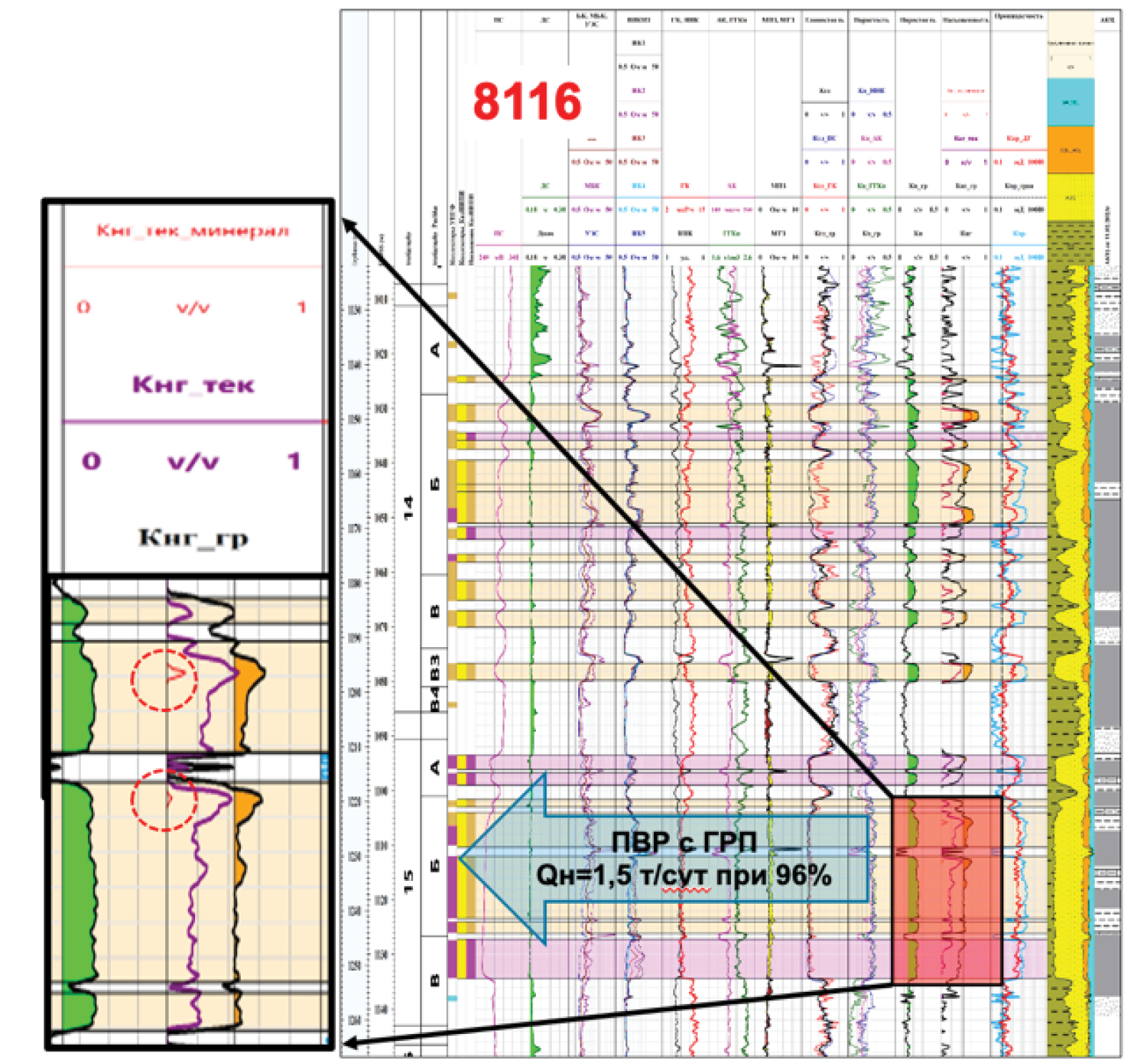 На рис. 12 на примере скважины 8116 представлены РИГИС, которые показывают, что по результатам пересчёта с учётом текущей минерализации значение коэффициента нефтенасыщенности пласта (Кнг_гр) стало ниже начального, что свидетельствует об увеличении доли воды.