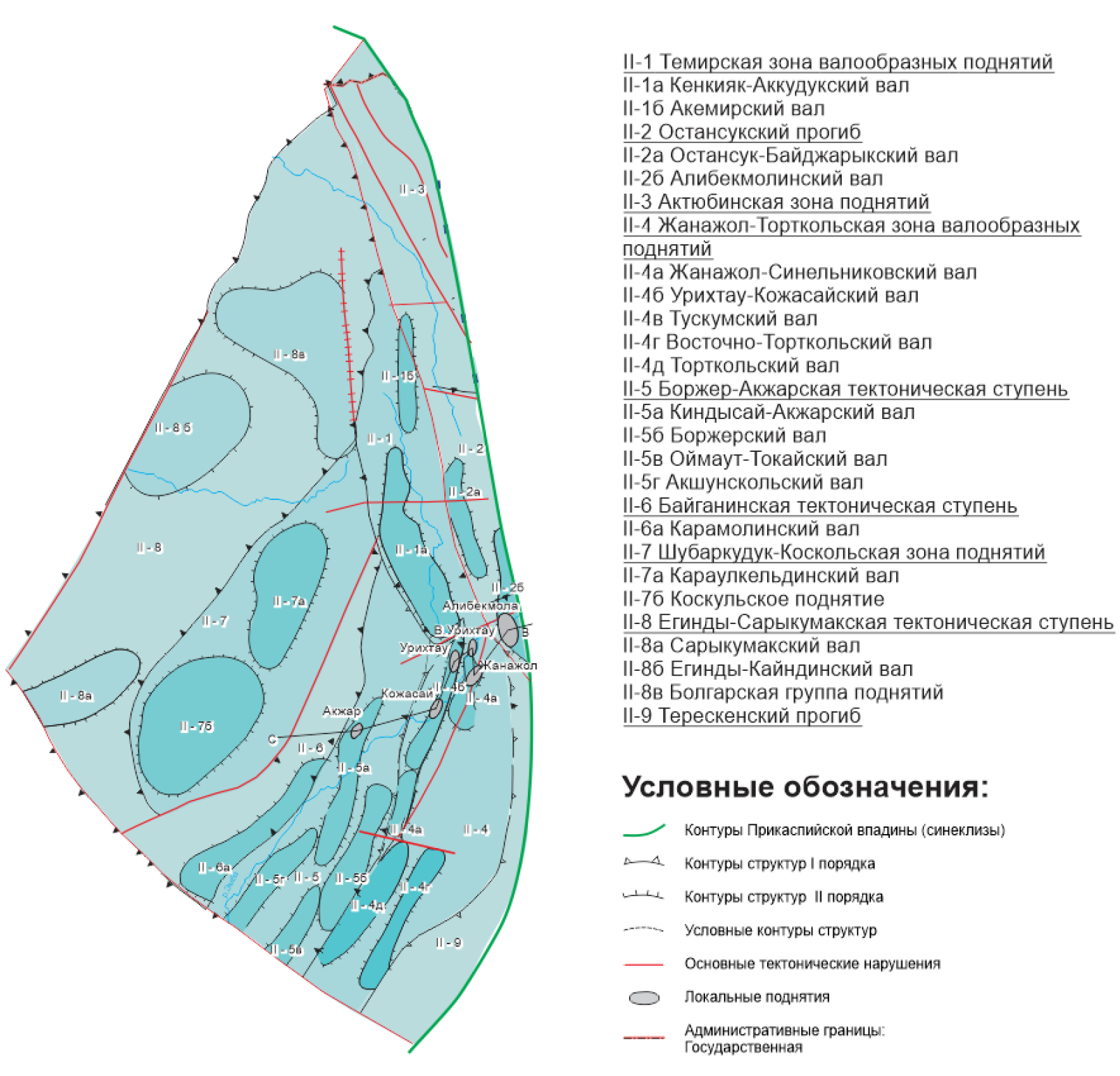 Рисунок 2. Схема тектонического районирования Восточной части Прикаспийской впадины [1]