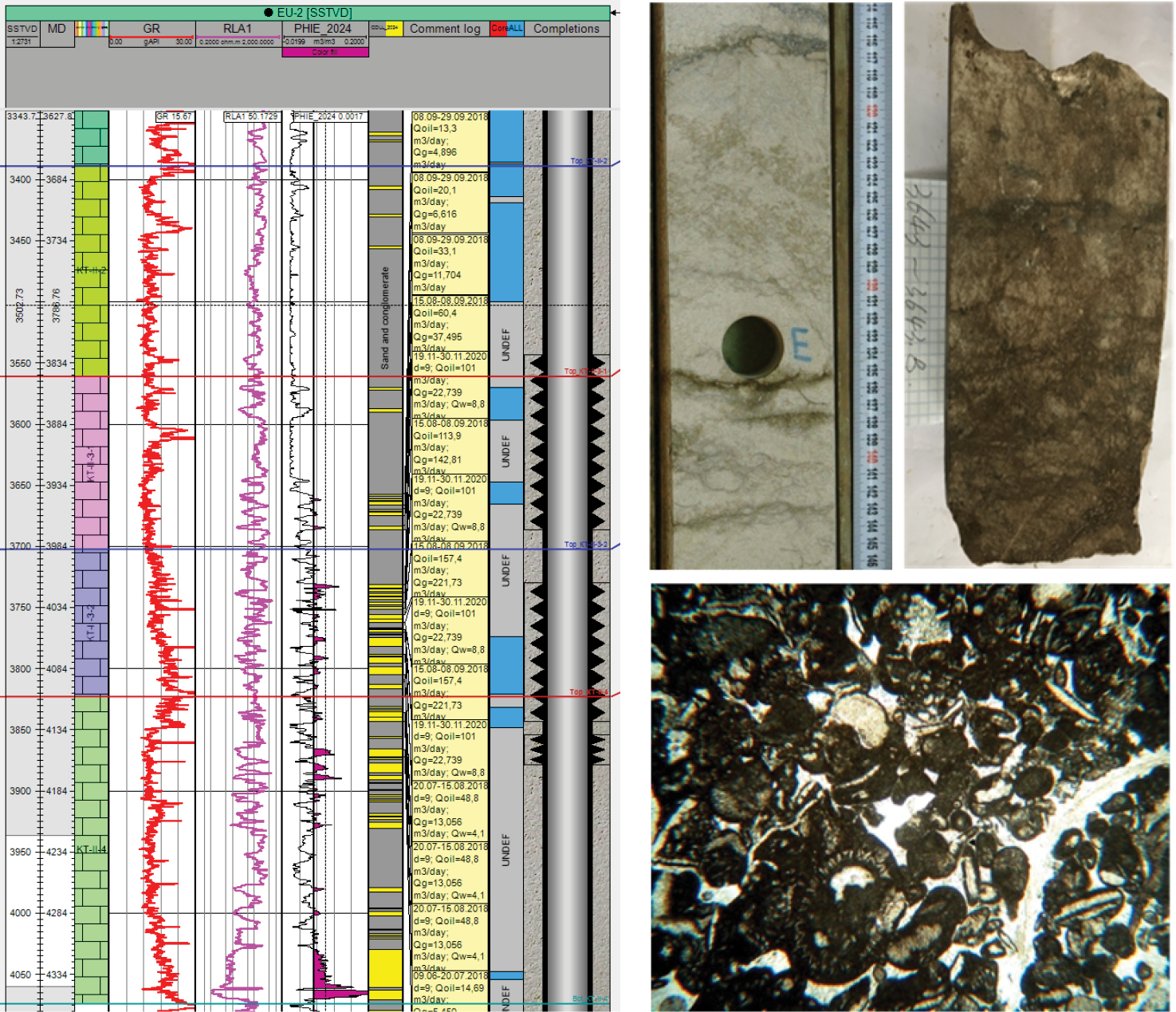 Рисунок 3. Месторождение Восточный Урихтау, скважина ВУ-2. Сопоставление ГИС и керна