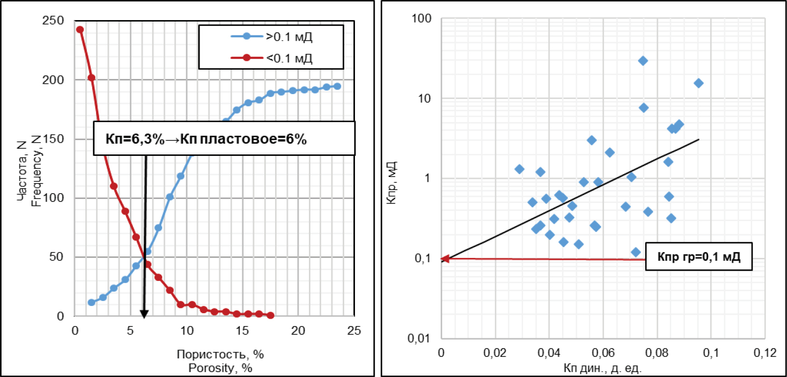 Кп –коэффициент пористости / porosity coefficient; Кп пластовое – пластовый коэффициент пористости / reservoir porosity coefficient; Кпр_гр – граничный коэффициент проницаемости / limiting permeability coefficient; Кпи_дин. – динамический коэффициент проницаемости /dynamic permeability coefficient