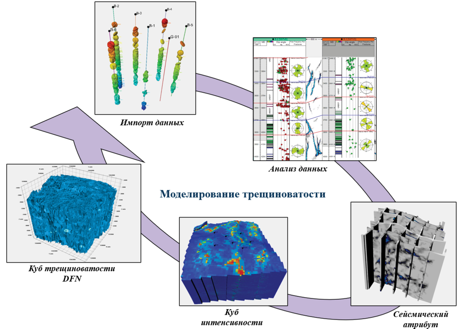 Процесс построения модели трещиноватости включает несколько ключевых этапов: импорт и анализ исходных геолого-геофизических данных, построение трендовой модели с использованием сейсмических атрибутов, определение направлений трещин, моделирование их интенсивности и на финальном этапе, создание дискретной модели трещин (DFN) (рис.6).