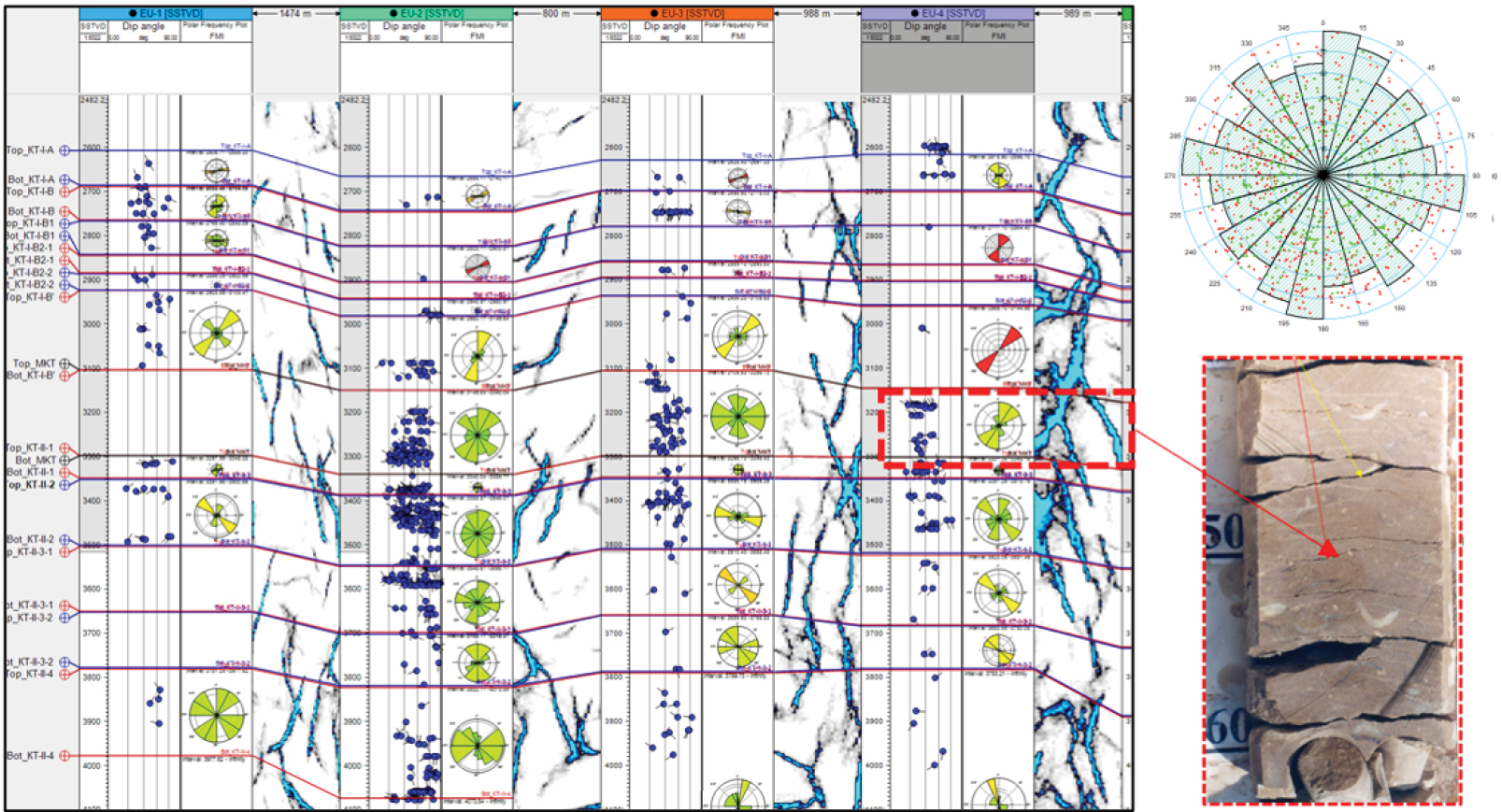 В ходе анализа выявляются ключевые параметры трещин, такие как зона развития, направление, апертура. Интерпретированные данные были импортированы в программное обеспечение Petrel, что позволило провести дальнейший анализ. Основные направления простирания трещин были определены как NE-SW (англ. North-East – South-West – северо-восток – юго-запад), что в целом соответствует ориентации основных разломов. Результаты интерпретации микроимиджеров показаны на рис. 7.