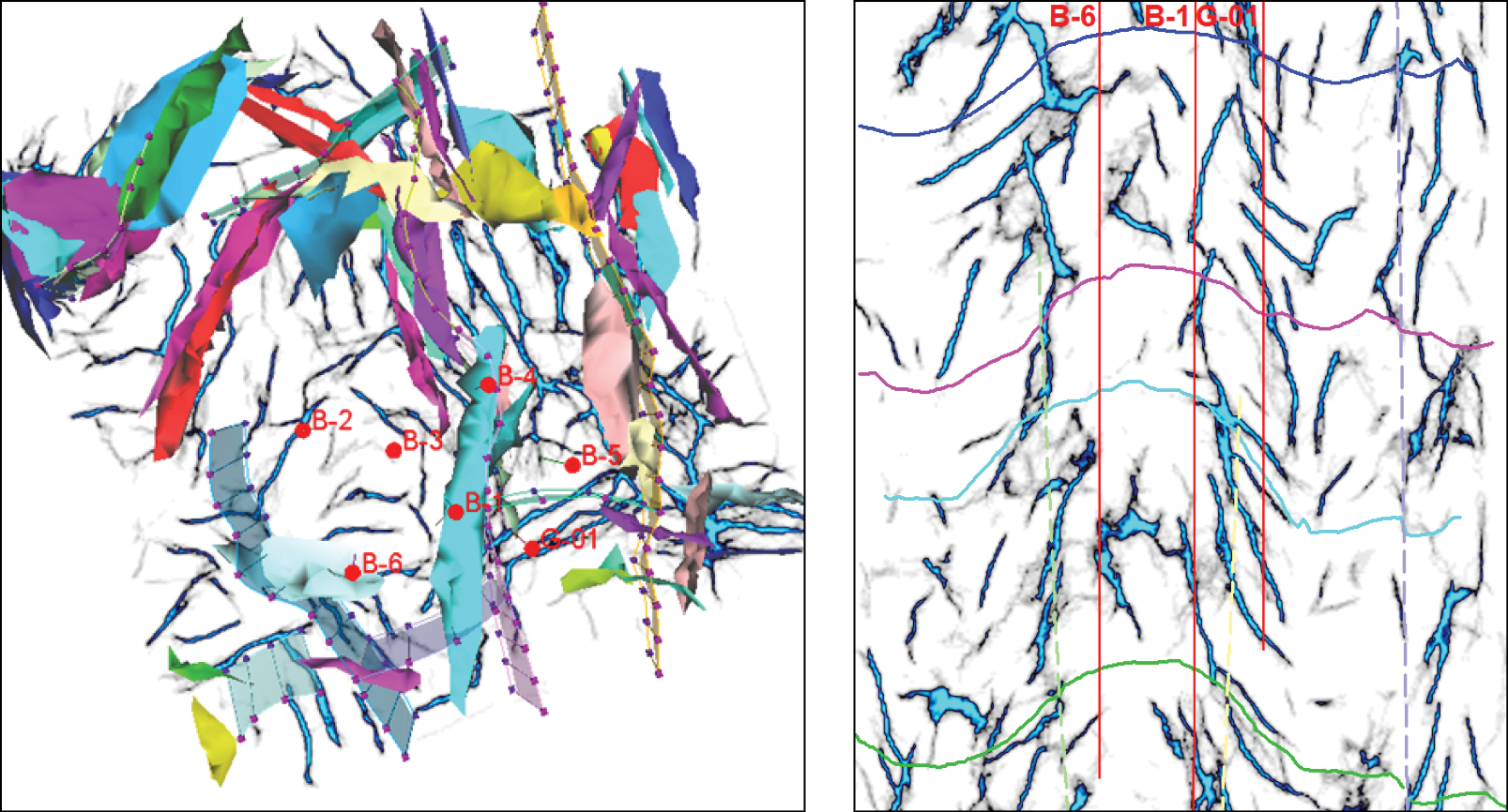 На рассматриваемом месторождении было пробурено семь скважин: В-1–В-6, а также скважина Г-01, пробуренная в 1980-х гг. По всем скважинам были проведены комплексные геофизические исследования (далее – ГИС), включая FMI-анализ (от англ. Formation Micro Imager – электрический микроимиджер). По данным интерпретации FMI, в разрезе продуктивных горизонтов наблюдаются трещины различной раскрытости. Анализ керна также подтверждает наличие трещиноватых зон, оказывающих влияние на ФЕС.