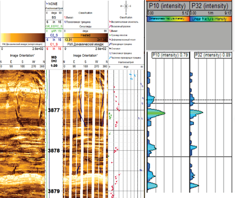 Расчет плотности трещин воспроизведен на основе данных микросканеров, в результате чего формировалась каротажная кривая по скважине (Intensity Log) (рис. 10).