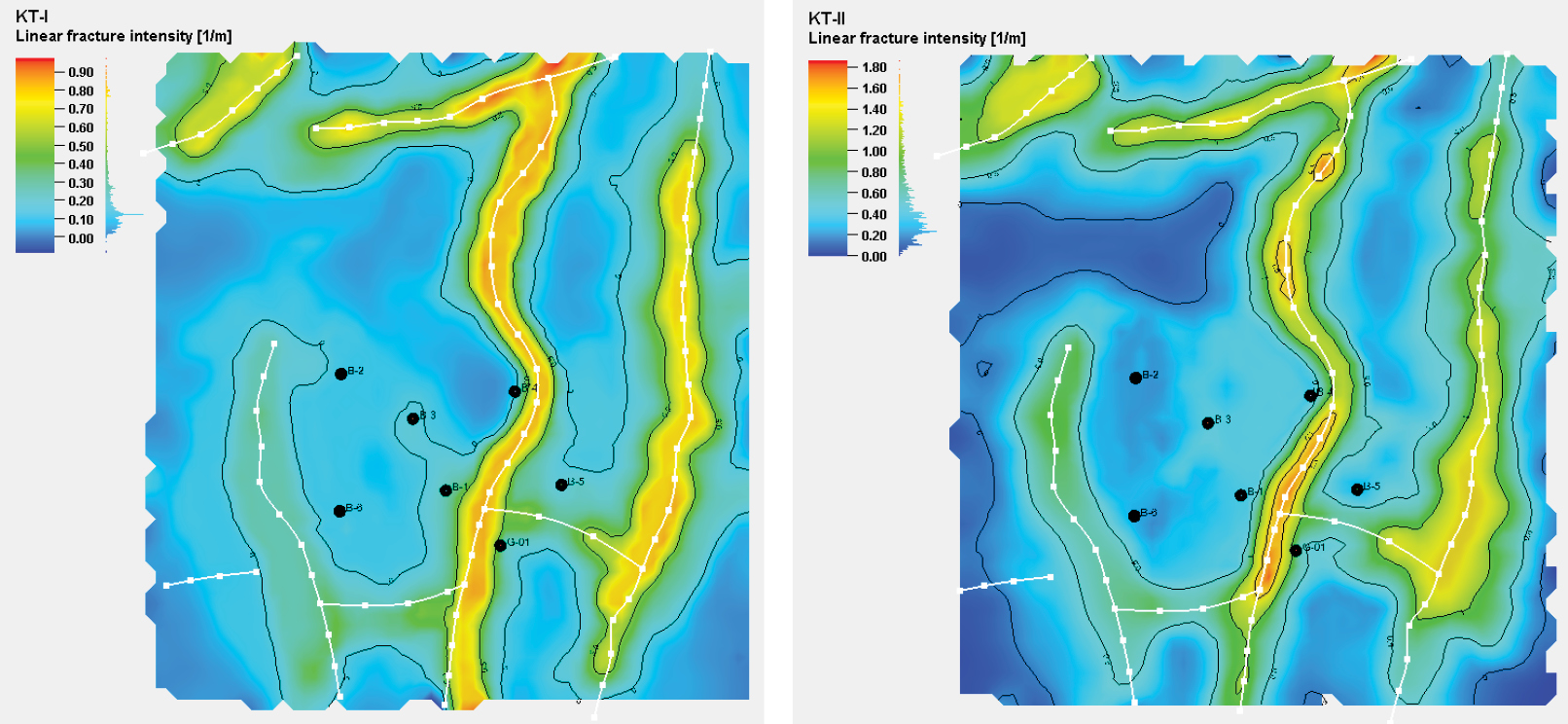 Figure 12. Fracture intensity maps for KT-I and KT-II zones