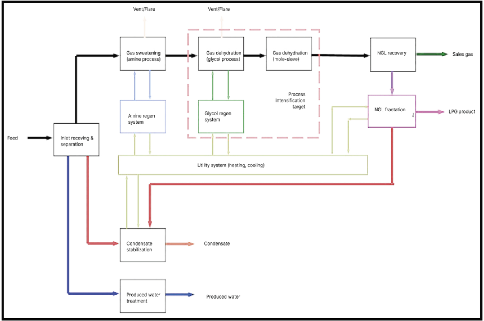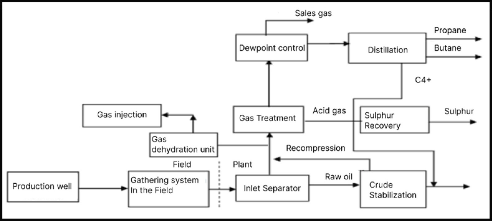In order to meet the technical requirements for finished products, the processing trains of the plant should be equipped with inlet separators, gas dehydration units, gas sweetening unit and sour (raw) gas injection system.
