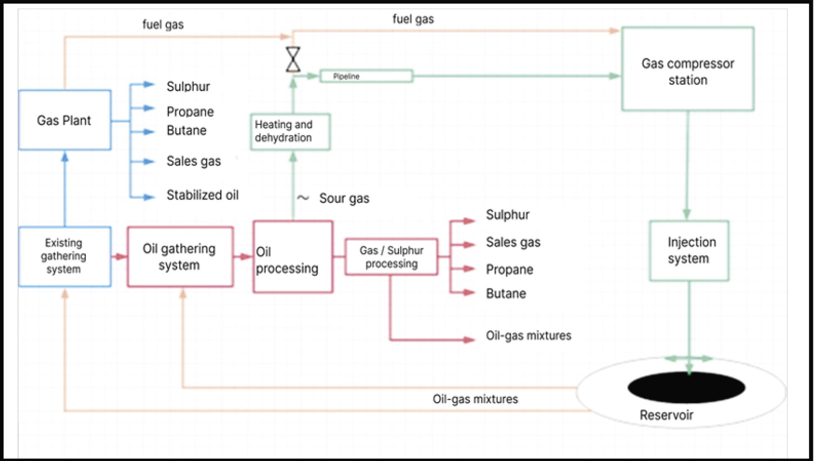 The associated raw gas intended for injection is dried to remove all water and heated so that the gas temperature at the compressor inlet is above the hydrocarbon dew point. During normal operation, this prevents the formation of hydrocarbon liquid in the pipeline and deposits in the sludge trap on the compressor station raw gas line. However, condensation cannot be avoided during start-up, shutdown and other cases where the pipeline temperature drops. Therefore, in such cases, provision is made to remove the sulfur-containing liquid if necessary. Liquid condensate accumulated at the compressor station is returned back to processing through the central field manifold. Injection compressor including the three-stage turbine-driven injection compressor, the interstage knockout drums and air-cooled heat exchangers, seal gas compressor system and fuel gas conditioning skid.