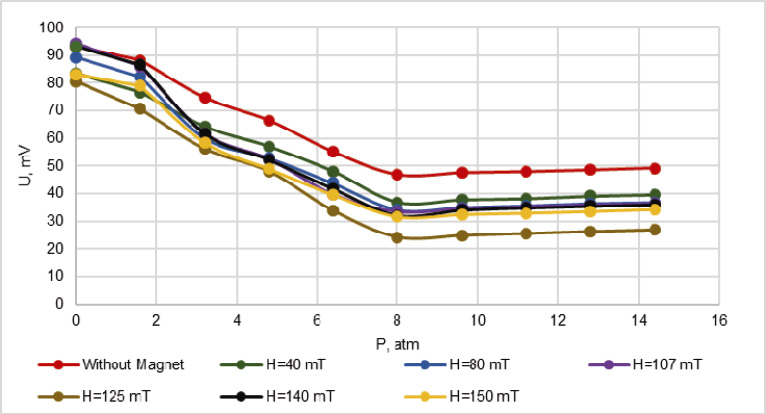 Before initiating the experiment, the initial voltage and resistance values are recorded. The experiment is conducted at a pressure of P = 1.6 atm, across a pressure range of 1.6–14.4 atm. The intensities of the electromagnet’s magnetic field 40, 80, 107, 125 and 140 mT are investigated sequentially for each pressure level mentioned.