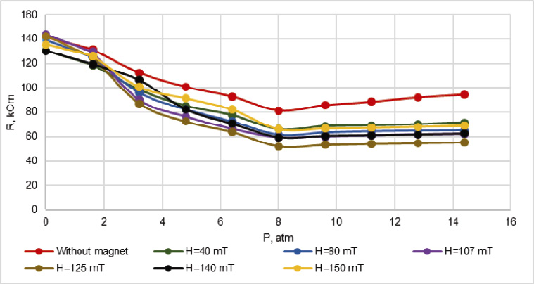 Figure 3 illustrates the variation of resistance (R, kOm) as a function of pressure (P, atm) under experimental conditions with and without the application of magnetic fields of varying intensities. The graph includes results for a control case where no magnetic field is applied (red line) and for cases where magnetic fields of intensities H = 40 mT, H = 80 mT, H = 107 mT, H = 125 mT, H = 140 mT and H = 150 mT are applied. The study examines the impact of magnetic fields on resistance during pressure changes, shedding light on the potential electrokinetic and fluid dynamic effects induced by magnetic field application.