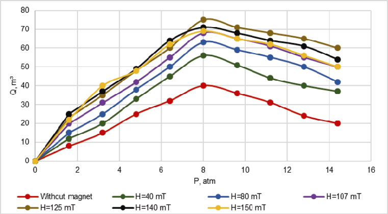 The graph in Figure 4 demonstrates the relationship between discharged water volume (Q, m³) and applied pressure (P, atm) under conditions with and without the application of electromagnetic fields at varying intensities (H, mT). The “without magnet” case (red curve) serves as the baseline, showing a steady increase in discharged water volume up to 8 atm, where it peaks at about 40 m³. Beyond this pressure, the discharge volume decreases consistently, likely due to factors such as reduced permeability or increased flow resistance at higher pressures.