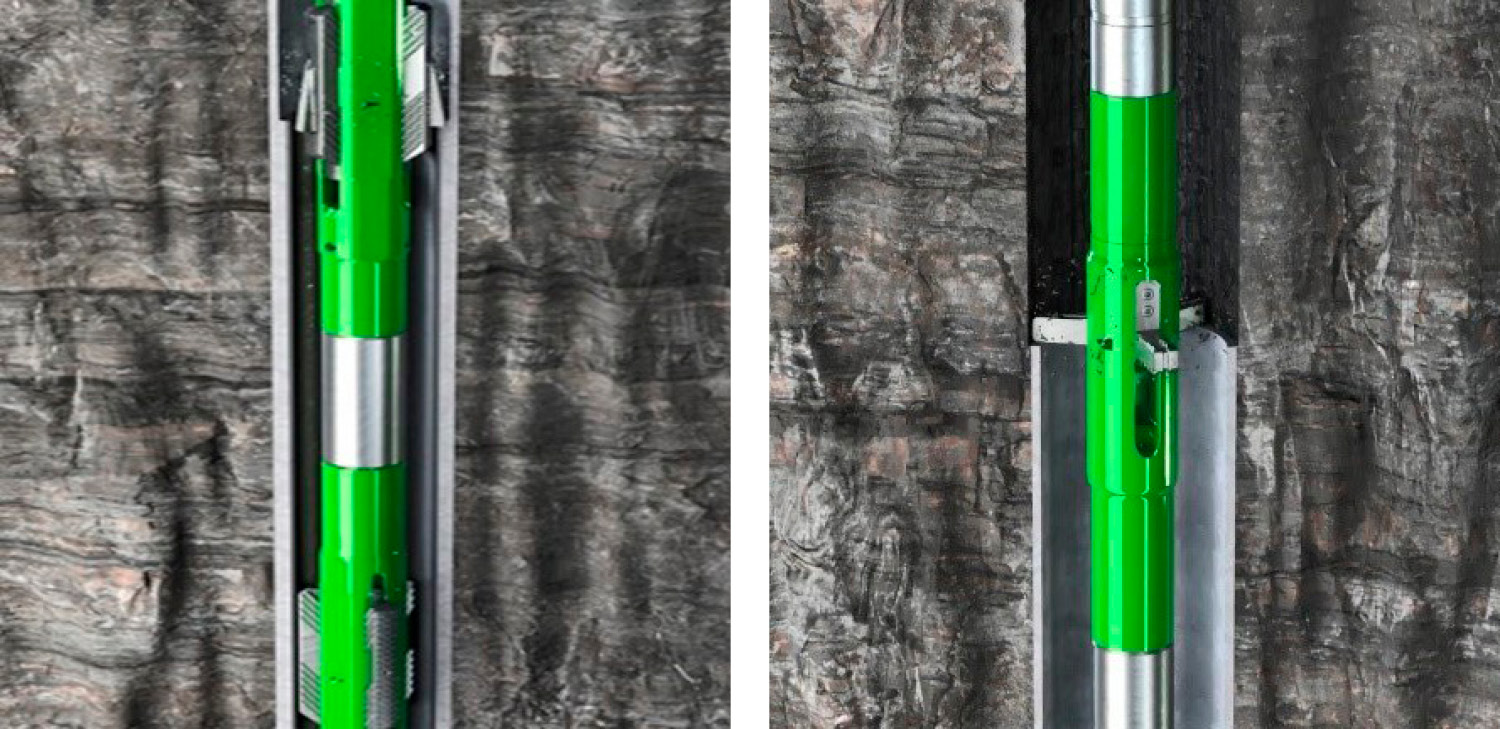 ProMILL Duo включает в себя узел мостовой пробки (Bridge Plug), коническую фрезу (Taper Mill), модуль активной стабилизации (Active Stabilization Module), секцию фреза с высоким коэффициентом расширения (High Expansion Ratio Section Mill) и расширитель Underreamer (PMUR). Высокая степень расширения секции фреза ProMILL Duo позволяет ей проходить через внутреннюю ОК во втянутом состоянии и при срабатывании раскрываться на больший диаметр для фрезерования наружной ОК с муфтой. Модуль активной стабилизации оптимизирует динамические характеристики и сводит к минимуму вибрацию конструкции низа бурильной колонны (далее – КНБК). Расширение скважины для создания барьера «порода к породе» осуществляется с помощью PMUR (рис. 6).