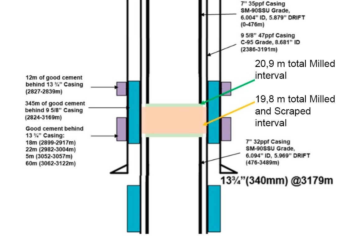 На этапе фрезерования был успешно отфрезерован участок длиной 20,9 м высокопрочной, устойчивой к сероводороду обсадной колонны диаметром 7” (177,8 мм) со средней скоростью проходки 0,31 м/ч. После активации расширителя с высоким передаточным числом HRU общий интервал фрезерования и удаления ЦК внутри ОК 95/8” достиг 19,8 м – и всё это за один рейс. Износ ножей K-Mill составил 16%, что подчеркивает исключительную долговечность запатентованной технологии пластин TruEdge от WIS даже после 67,3 ч непрерывного фрезерования.