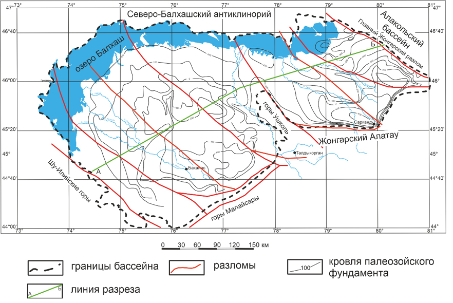 Фундамент ББ сложен дислоцированными протерозойскими и палеозойскими комплексами пород, которые отражают сложную эволюцию формирования структур Центрального и Южного Казахстана, известных под названием Жонгаро-Балхашской герцинской складчатой системы [1–10].