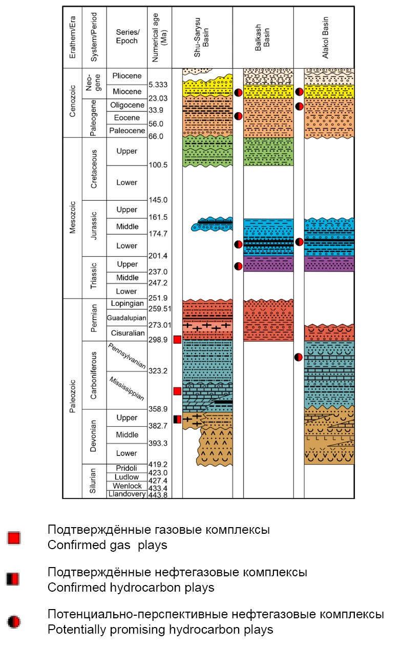 Figure 5. Lithological and stratigraphic sequences of several sedimentary basins in Kazakhstan with confirmed and potentially promising hydrocarbon plays [6, 7, 9]