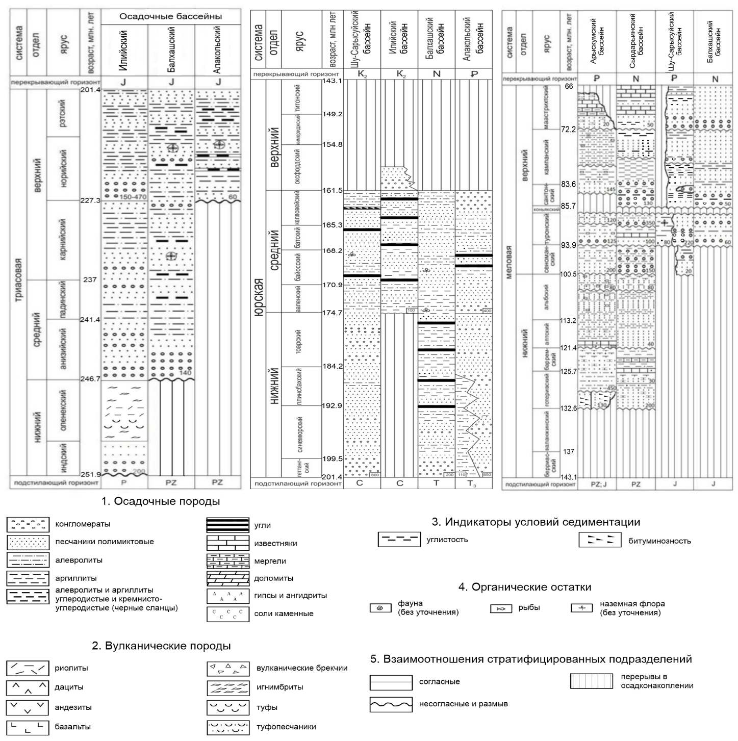 Figure 6. Lithological and stratigraphic sequence of the deposits of the Balkhash basin and adjacent territories