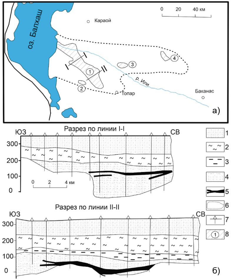 Отложения (рис. 7, б): 1 – четвертичные; 2 – неогеновые; 3 – палеогеновые; 4 – юрские; 5 – угольные пласты; 6 – граница буроугольного бассейна; 7 – разведочные скважины; 8 – угольные месторождения (1–4, рис. 7, а)): 1 – Нижнеилийское; 2 – Балатопарское; 3 – Кертуленское; 4 – Орта-Баканасское.