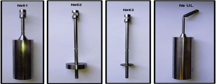 Диапазон измерения вязкостей шпинделей: №61 – 100–1000 сП; №62 – 500–5000 сП; №63 – 2000–20000 сП; № UL – 10–100 сП