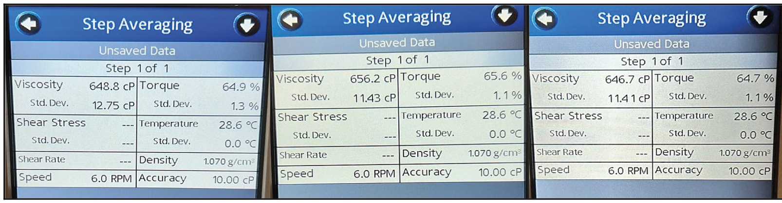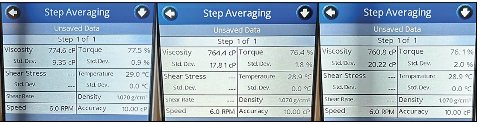 Замер вязкости. С целью определения вязкости раствора полимера, приготовленного в разных водах, произведён сравнительный замер вязкости. Замеры выполнены на вискозиметре BROOKFIELD AMETEK DV2T MultiDrive.