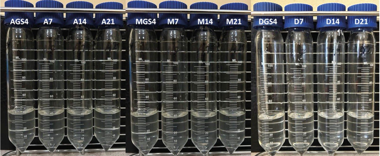 A – solution prepared with Alb-Cenomanian water; M – solution prepared with marine water; D – solution prepared with distilled water. The numbers 7, 14, and 21 indicate the number of days in the thermostatic chamber. AGS4, MGS4, and DGS4 – polymer solutions based on Alb-Cenomanian, marine, and distilled waters, respectively. Gelation was assessed after 4 hours.