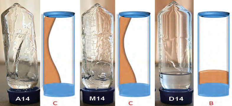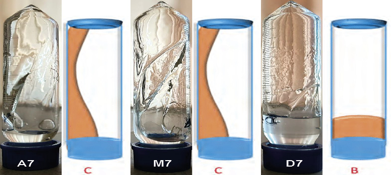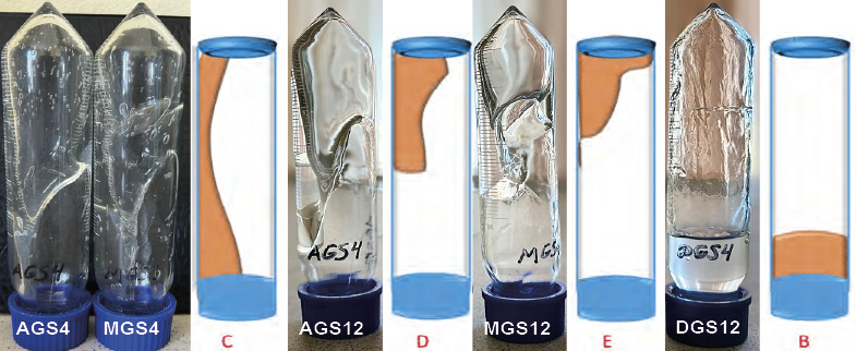 AGS4 и MGS4 демонстрируют одинаковую степень прочности через 4 ч в термошкафу. В пробе DGS4 гелеобразование не наблюдается. Для дальнейшей оценки гелеобразования пробы были дополнительно выдержаны в термошкафу, увеличив суммарное время выдержки до 12 ч. После дополнительной выдержки наиболее прочный гель образовался в пробе MGS12, тогда как в пробе AGS12 гель оказался более текучим. В пробе DGS12 гелеобразование по-прежнему отсутствует и относится к категории B (рис. 7).