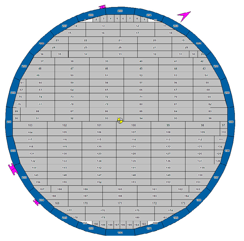 The tank bottom is constructed from multiple steel plates arranged in a structured layout. It consists of bottom plates and annular plates as in Fig. 1, with the latter forming a reinforced ring along the perimeter. Annular plates are typically thicker than the central plates to handle increased stress near the shell-to-bottom joint.