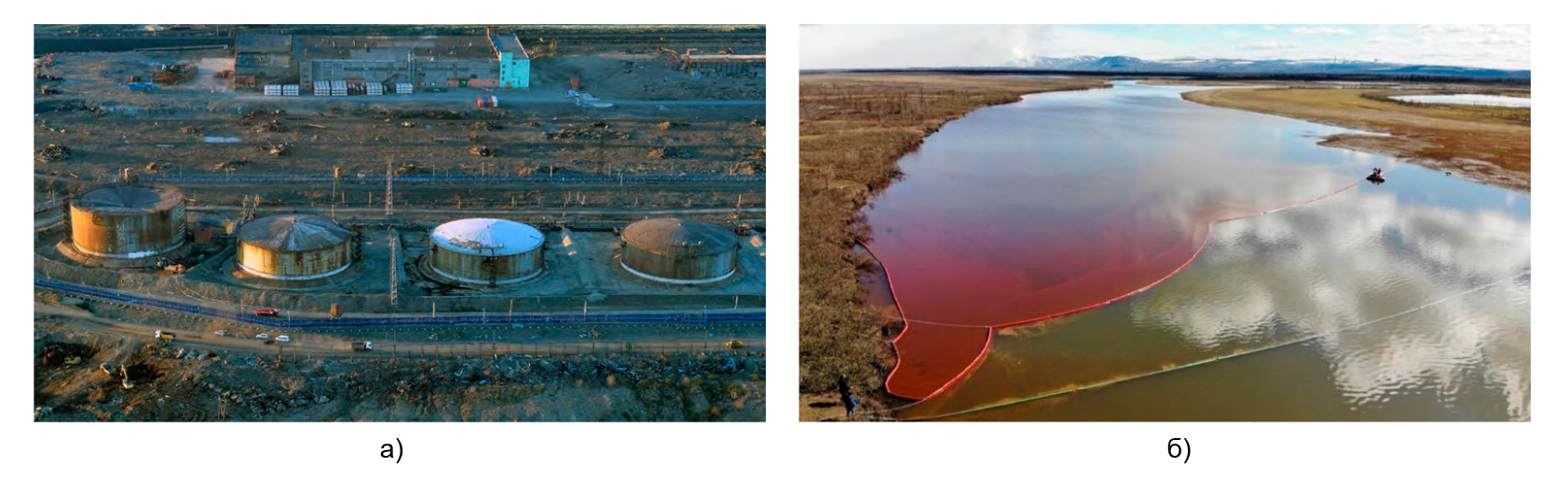 a) Collapsed Storage Tank at Norilsk Power Plant; b) Aerial View of the Contaminated River