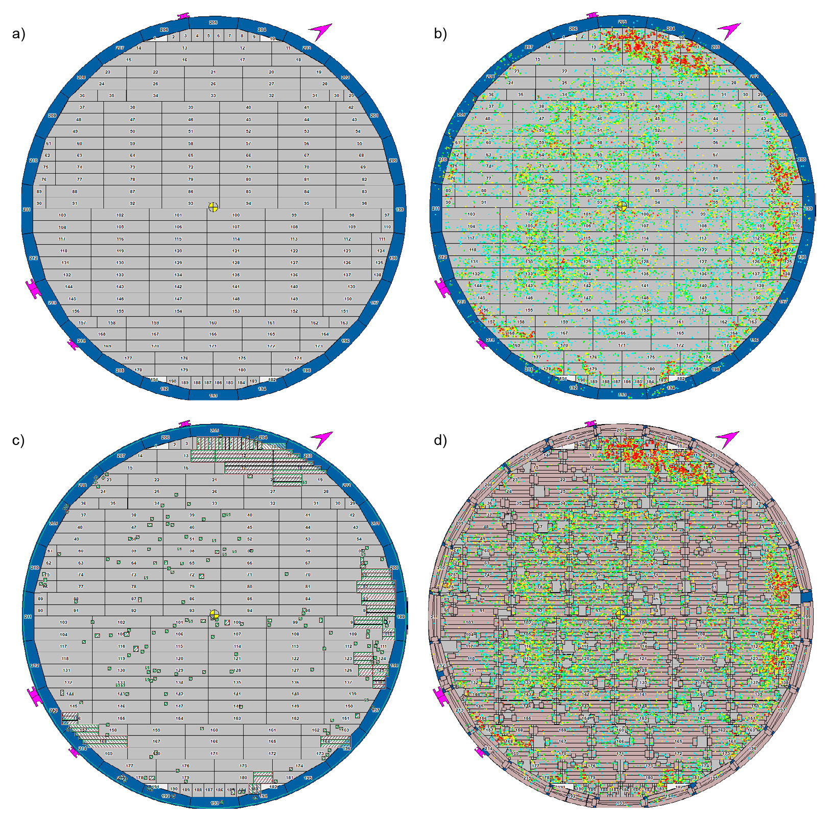 a) general scan visualization; b) identified corrosion defects; c) visualization of bottom plate repair/replacement; d) scanned bottom plates with detected anomalies