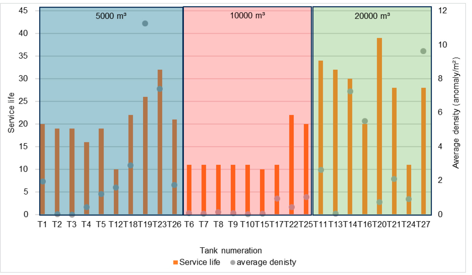 Figure 7. Analysis of service life and anomaly density in storage tanks of different capacities