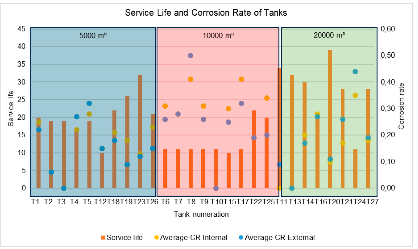 The chart in the Fig. 8 shows the service life and corrosion rate of tanks with capacities of 5000 m3, 10000 m3, and 20000 m3. The orange bars represent service life, while the blue and purple dots indicate the average internal and external corrosion rates, respectively.