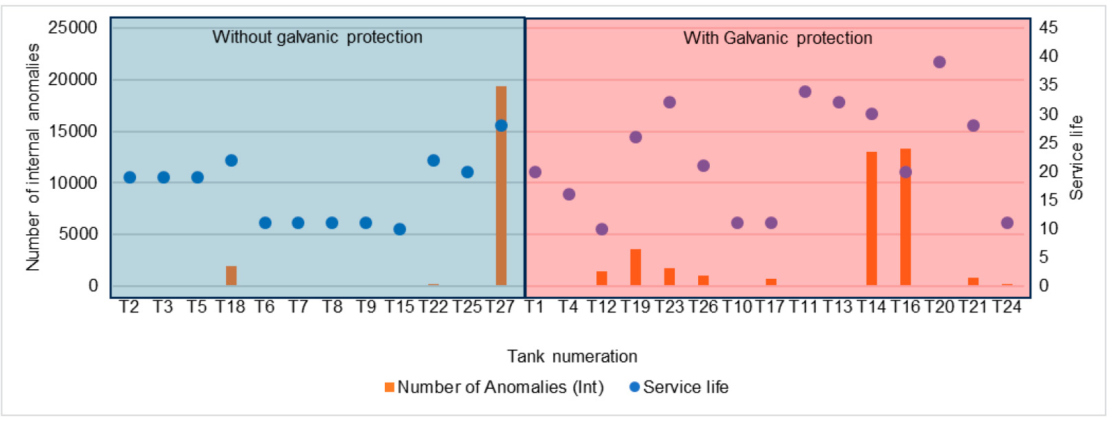 In addition, Fig. 10 presents a comparative analysis of tanks with and without galvanic protection, showing the number of internal anomalies and the corresponding service life. The tanks on the left side, shaded in blue, represent those without galvanic protection, while those on the right side, shaded in red, are equipped with galvanic protection.