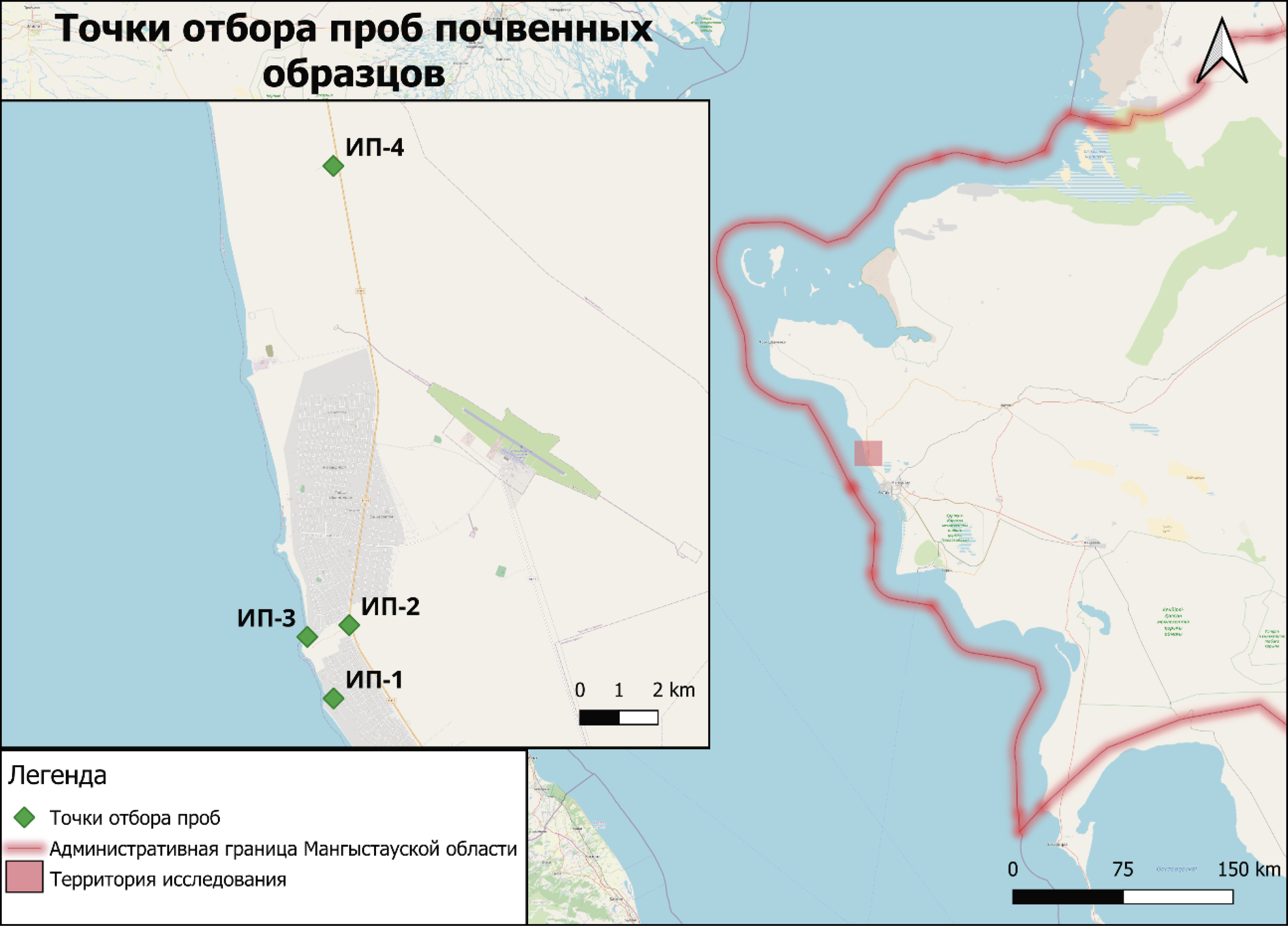 ИП-3 находится в районе частных построек в пригороде с. Шапагатова, на расстоянии 2135 м от ИП-2. Контрольная точка ИП-4 находится на расстоянии 9578 м от ИП-3 и была выбрана для мониторинга воздействия окружающей среды. На рис. 1 изображена карта точек отбора проб почвы в прибрежной зоне, составленная в программном комплексе (далее – ПК) QGis 3.324.
