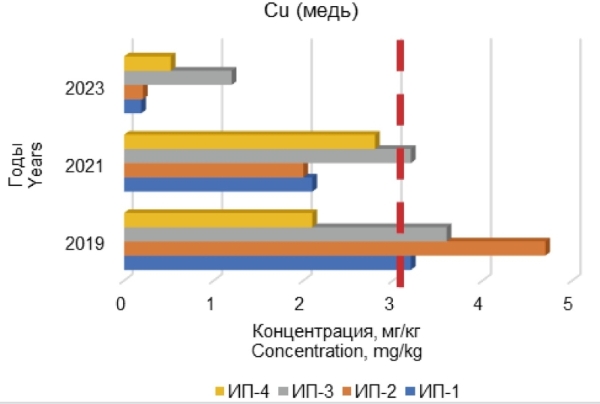 Полученные результаты анализа почв свидетельствуют о резком снижении концентраций всех тяжёлых металлов в течение пяти лет исследования. Данная динамика представлена на рис. 3 на примере меди. Было отмечено превышение ПДК меди в 2019 г. в 1,6 раз, однако значения данного показателя снизились в 22 раза к 2023 г. Подобное явление может быть связано с несколькими факторами, включающими естественную ремедиацию почв, эрозионные процессы и выщелачивание.