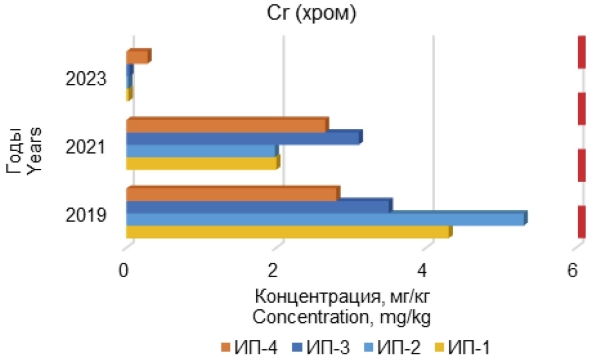 Figure 4. Dynamics of chromium concentration in soil samples in 2019, 2021, and 2023.