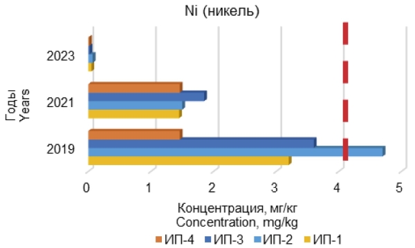 Рисунок 5. Динамика концентрации обнаруженного в почвенных образцах никеля в 2019, 2021 и 2023 гг.