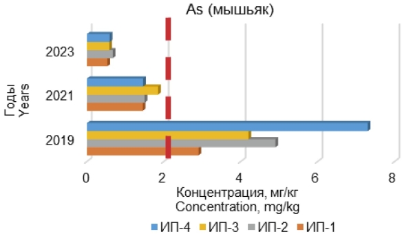 Рисунок 6. Динамика концентрации обнаруженного в почвенных образцах мышьяка в 2019, 2021 и 2023 гг.